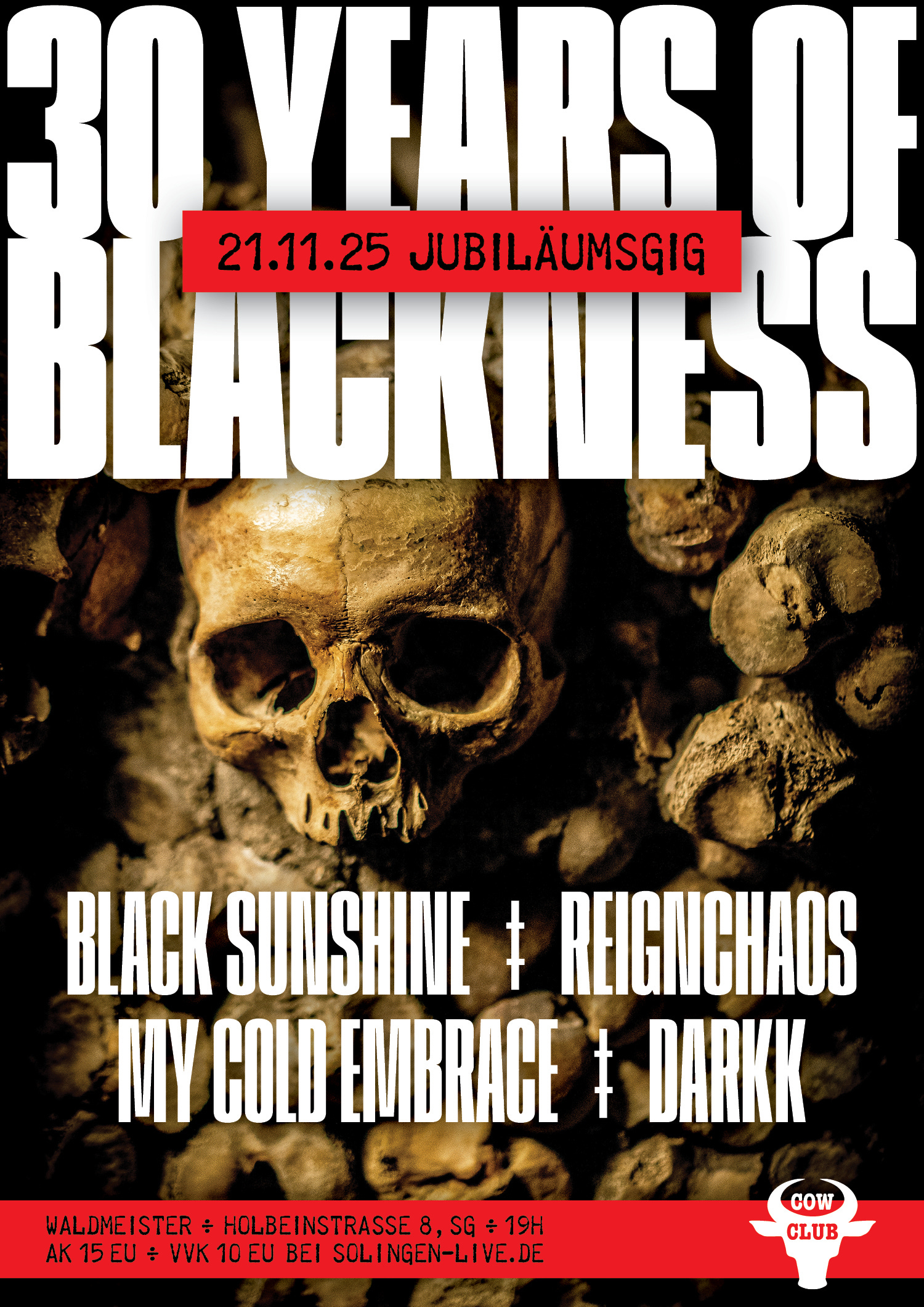 21.11.2025 30 YEARS OF BLACKNESS w/ Darkk, Reignchaos & My Cold Embrace. Waldmeister, Holbeinstraße 8, 42719 Solingen. 8 pm.
