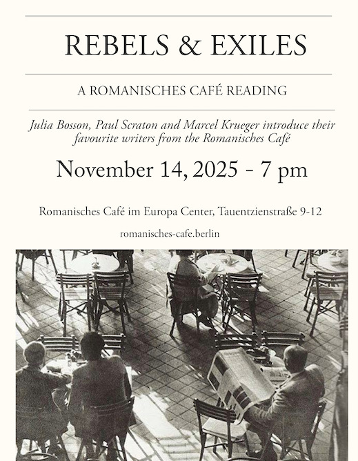On Friday, November 14, 2025, I’ll be talking with Julia Bosson and Paul Scraton about our shared fascination with the literature of Weimar Germany, and especially the regulars of the legendary Romanisches Café. We will introduce some of our favourite writers like Irmgard Keun, Joseph Roth and John Hoexter, and humbly juxtaposition some of their writing with our own. Presented by Slow Travel Berlin and the fascinating Romanisches Café exhibition at Europa Center. (English)